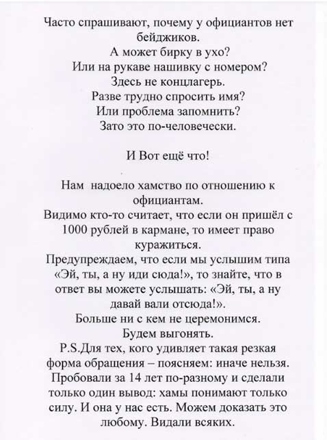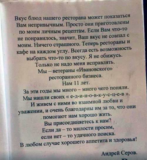 Как то проверяя новые публикации в интернете на тему ресторанов, наткнулся я на один пост, в котором гневно ругали хамовитые правила, которые владелец ресторана Серов опубликовал на первых страницах меню.