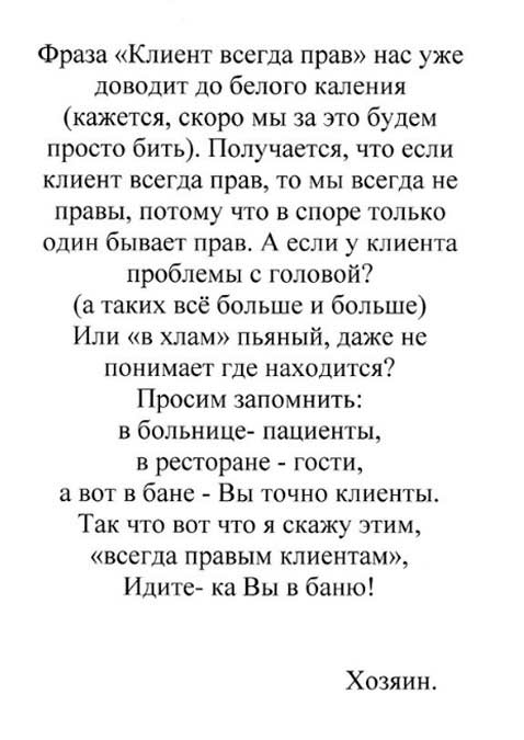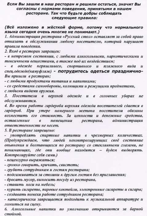 Ну что могу сказать, правила реальные, может написаны слегка в жестковатой форме, но на то они и правила. Вот только не совсем понимаю, если бы в ресторанах отсеивали по всем перечисленным правилам, то гостей было бы довольно мало, особенно по праздничным дням.
