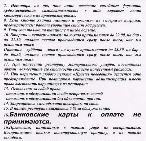 Тут также всё понятно, по крайней мере для меня ( с точки зрения официанта и администратора). Единственное, что мне не ясно, это пункт 15 про 5% обслуживания (не думал, что это еще где-то практикуется) и пункт 16, поскольку у нас за это идет штраф, мы не можем отказать в оплате картой, это противозаконно.