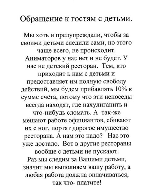 Если вы внимательно прочли лист выше, то заметили, что 10% будут прибавлены лишь тем, кто «предоставляет полную свободу действий» своим детям в ресторане. Действительно большое количество детей, бегающих по ресторану могут создавать трудности официантам, кроме того, дети легко могут нанести себе травму и причинять неудобство иным гостям в зале, бегая беспорядочно по залу.